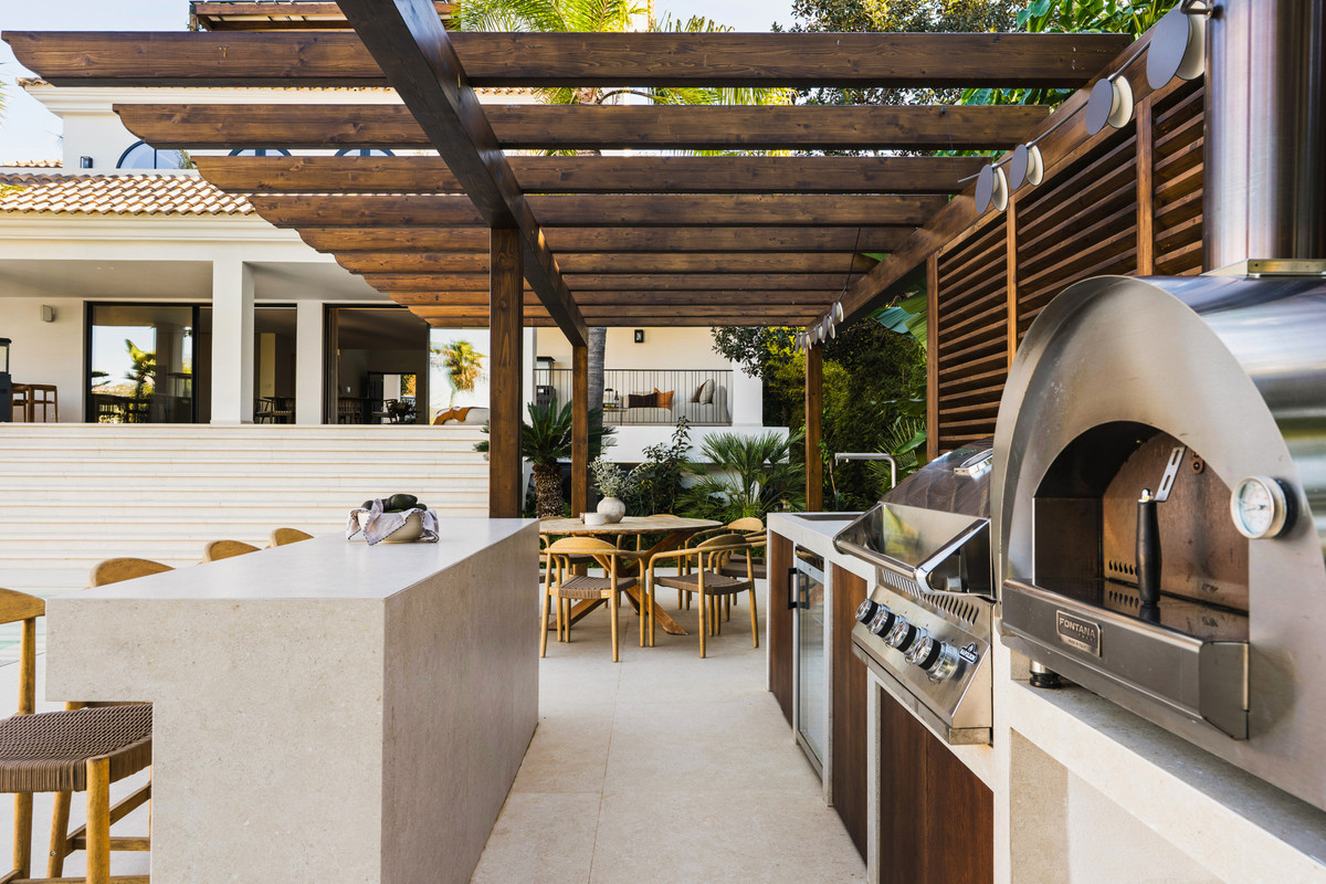 Les espaces extérieurs ont été conçus pour favoriser une véritable continuité entre intérieur et extérieur. Une élégante cuisine d'été avec bar jouxte une magnifique piscine d'eau salée chauffée, dotée d'un débordement miroir qui crée un effet visuel saisissant.
