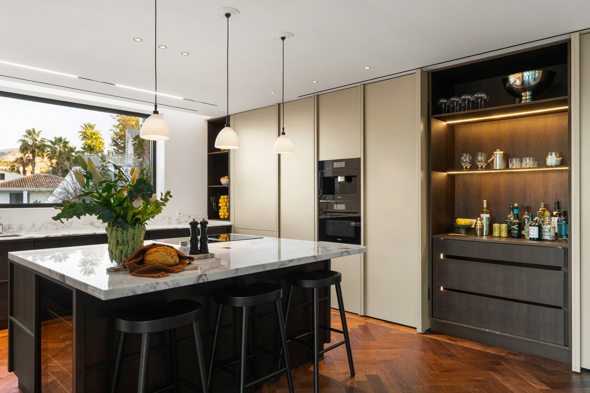 La cuisine est équipée d'appareils Miele haut de gamme et complétée par un élégant bar. Une arrière-cuisine/cuisine de chef séparée et dissimulée offre un espace très pratique, idéal pour recevoir et préparer des repas tout en préservant l'élégance de la pièce de vie principale.