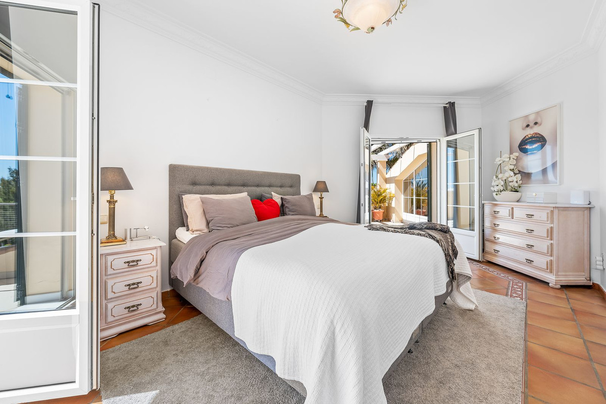 Un majestueux escalier double mène du séjour principal à l'étage supérieur, où se trouve la luxueuse suite parentale. Ce havre de paix privé comprend une salle de bains attenante avec baignoire jacuzzi et douche séparée, ainsi qu'une vaste terrasse offrant une vue imprenable sur la côte, Gibraltar et l'Afrique du Nord. Attenant à la suite parentale, un spacieux salon TV offre un confort et une modularité supplémentaires, avec la possibilité d'être transformé en une quatrième chambre.