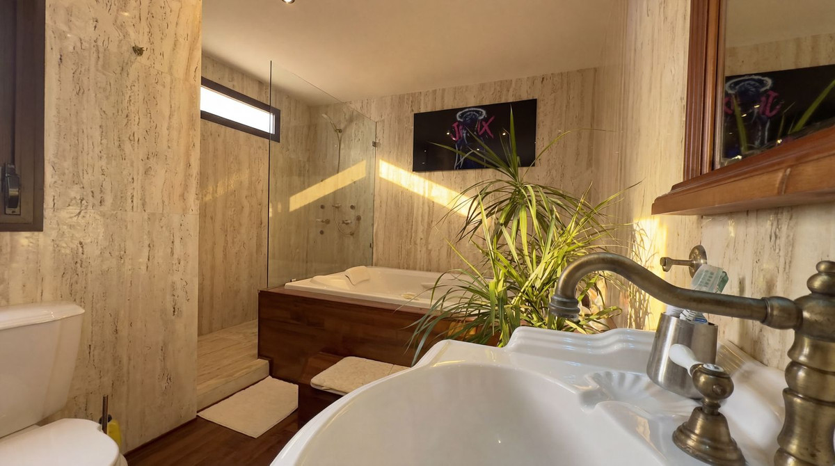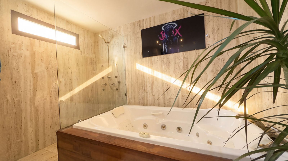La salle de bains offre une sensation de luxe et de détente, avec un généreux jacuzzi et une douche à l'italienne moderne, le tout habillé de murs imitation pierre naturelle – un espace idéal pour se relaxer.