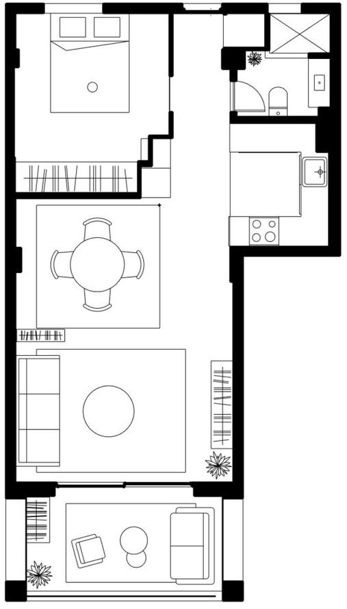 L'entrée donne sur une cuisine ouverte spacieuse et moderne, ainsi que sur une salle à manger. Une cloison sur mesure en chêne naturel sépare le coin salon, laissant ainsi la lumière circuler librement dans tout l'espace de vie sans nuire à la sensation d'espace.
