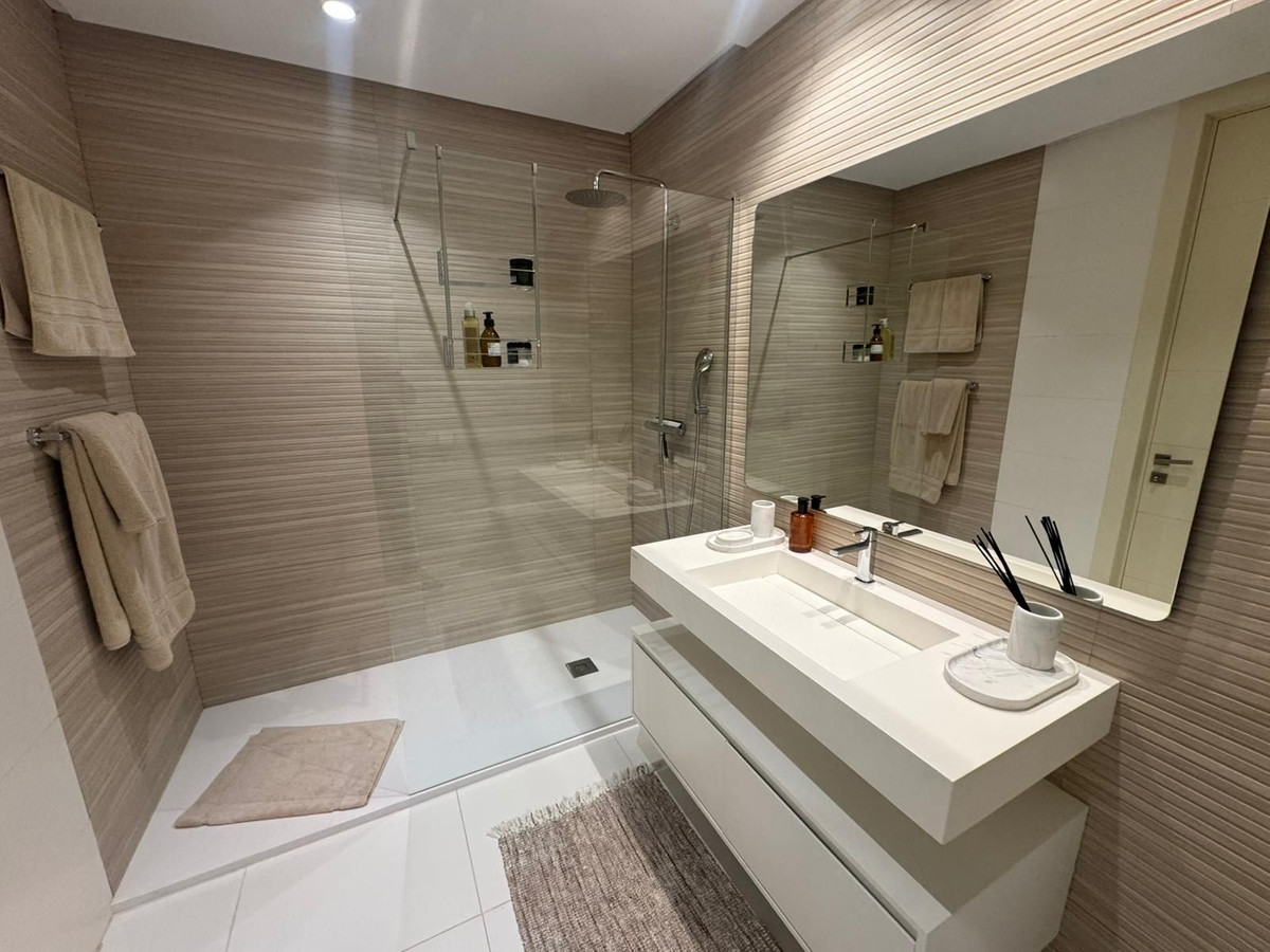 Cuisine design entièrement équipée, suite parentale élégante avec salle de bains Porcelanosa, chauffage au sol et baignoire balnéo. Chambre d'amis avec salle de bains privative.