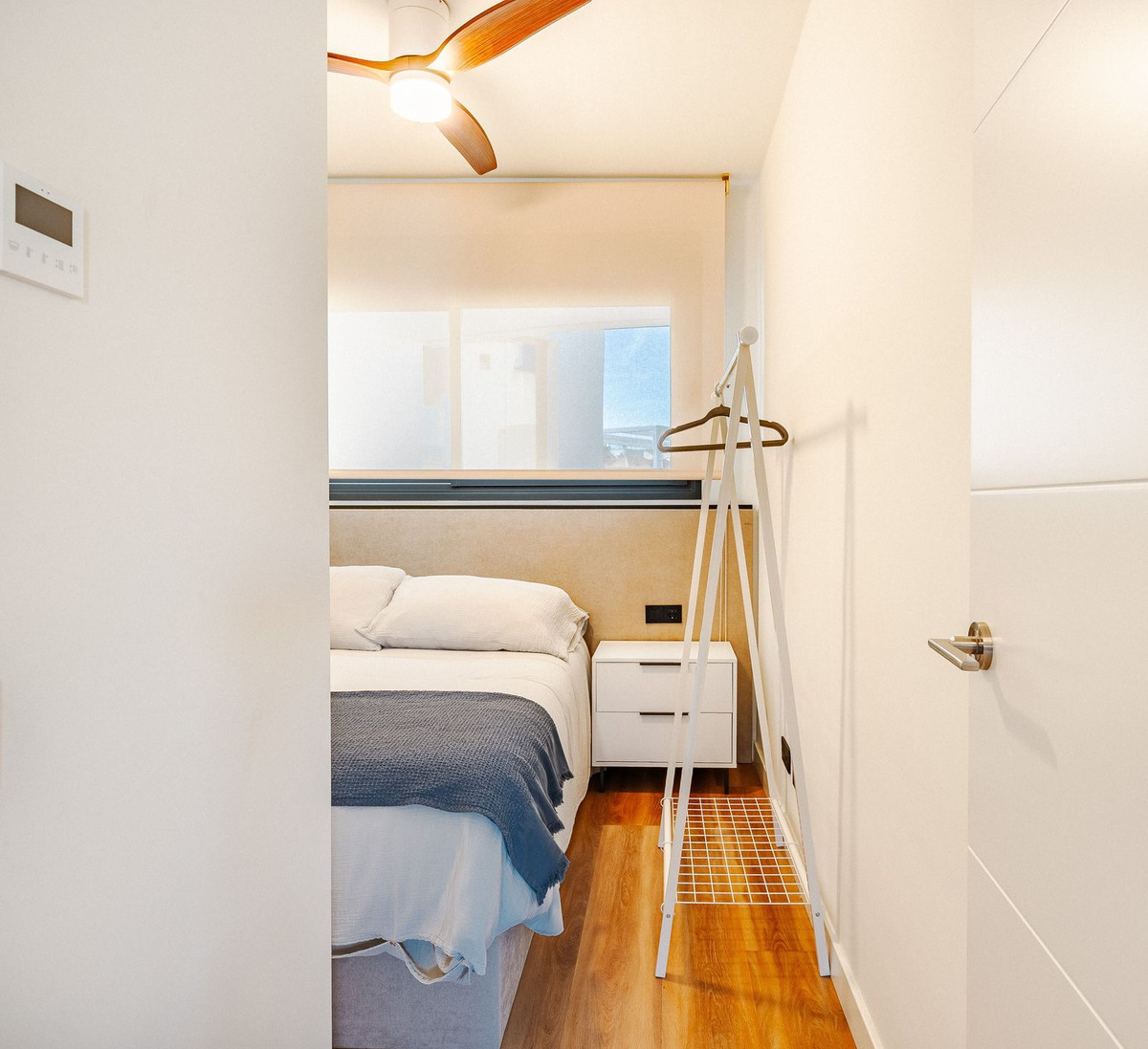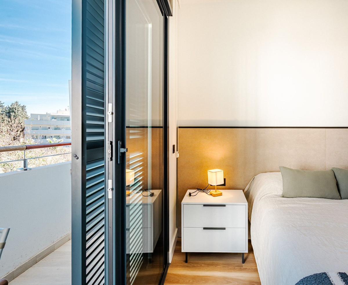 Le séjour donne directement sur la terrasse, d'où l'on peut admirer une agréable vue latérale sur la mer. De plus, le séjour et la chambre principale s'ouvrent tous deux sur les terrasses, offrant une luminosité naturelle exceptionnelle et une transition harmonieuse entre l'intérieur et l'extérieur.