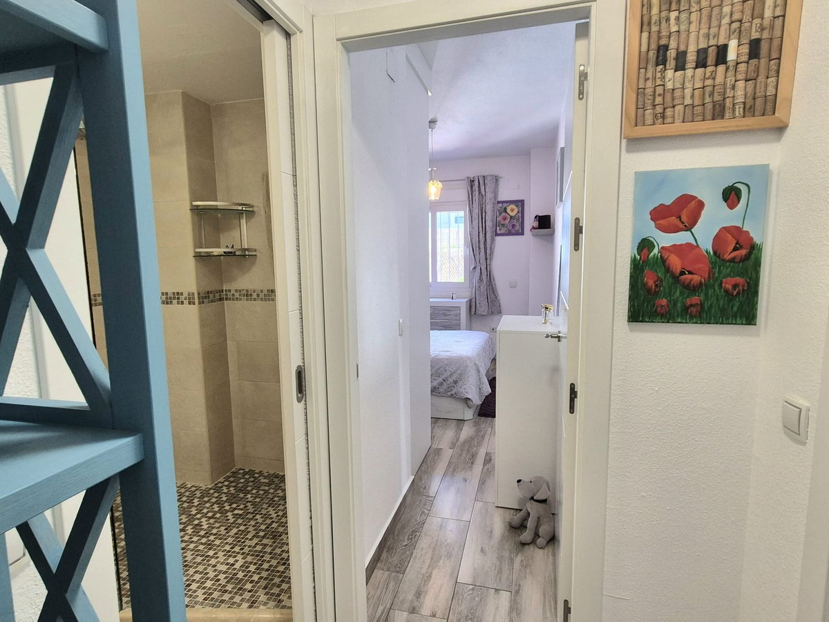 En entrant dans l'appartement, vous accédez à un hall d'entrée avec un espace pour les chaussures et les manteaux. À gauche, se trouve la grande cuisine rénovée et entièrement équipée avec four, plaques de cuisson et hotte aspirante. Toutes les fenêtres sont à double vitrage avec isolation thermique. De là, vous accédez à la terrasse arrière entièrement close, carrelée, qui comprend un abri de jardin et un robinet extérieur. De retour dans le hall, une porte coulissante donne accès au séjour/salle à manger. Ce dernier s'ouvre sur la terrasse avant, entièrement close et ensoleillée jusqu'à midi. Le sol est entièrement carrelé et les fenêtres sont équipées de moustiquaires. Depuis le séjour, une autre porte coulissante mène à un petit couloir. À gauche, se trouve la deuxième chambre, pouvant accueillir un lit double et dotée d'une armoire intégrée. La salle de bains attenante comprend une grande douche à l'italienne, un lavabo, un meuble-lavabo, un miroir connecté Bluetooth, des rangements, un sèche-serviettes électrique et une porte coulissante. Vous accédez ensuite à la chambre principale, qui dispose d'une armoire entièrement équipée avec étagères et penderie.