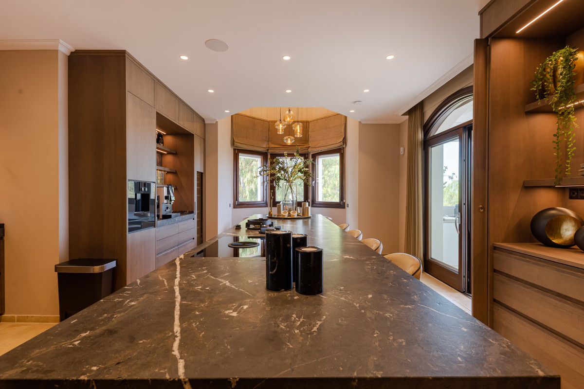 À l'intérieur, la villa a été soigneusement rénovée, conservant son charme espagnol traditionnel tout en offrant des équipements modernes. L'intérieur luxueux comprend un élégant salon principal avec plafond voûté, une salle à manger, un deuxième salon confortable, une cuisine moderne sur mesure avec