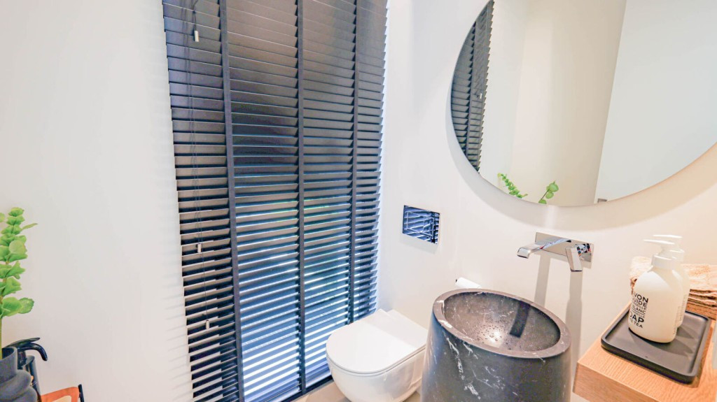 As soon as you enter the main hall, the stunning and breath-taking garden view becomes a permanent backdrop of green visible from the living and kitchen. The elegant living area with ethanol fire place is an open plan area for comfortable living and dining with impressive ceiling height and large windows enhancing the feeling of space and light. The kitchen is open plan and includes Gaggenau appliances. Every attention to detail has been thought of in the kitchen from the large island with an incorporated champagne cooler and coffee corner.