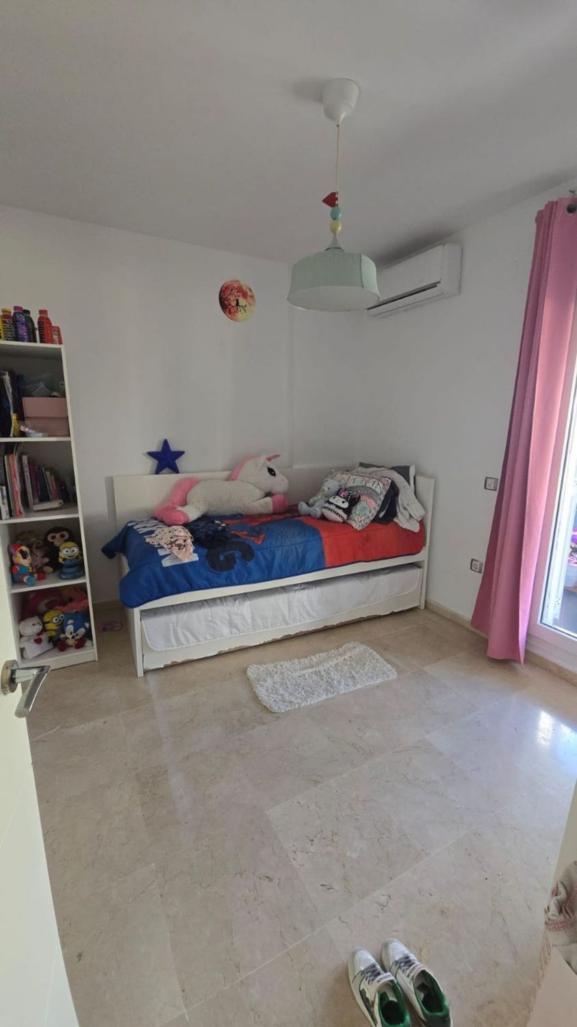 On y trouve trois chambres avec placards et climatisation, dont une avec une terrasse privée fermée, ainsi qu'une salle de bains complète à l'étage.