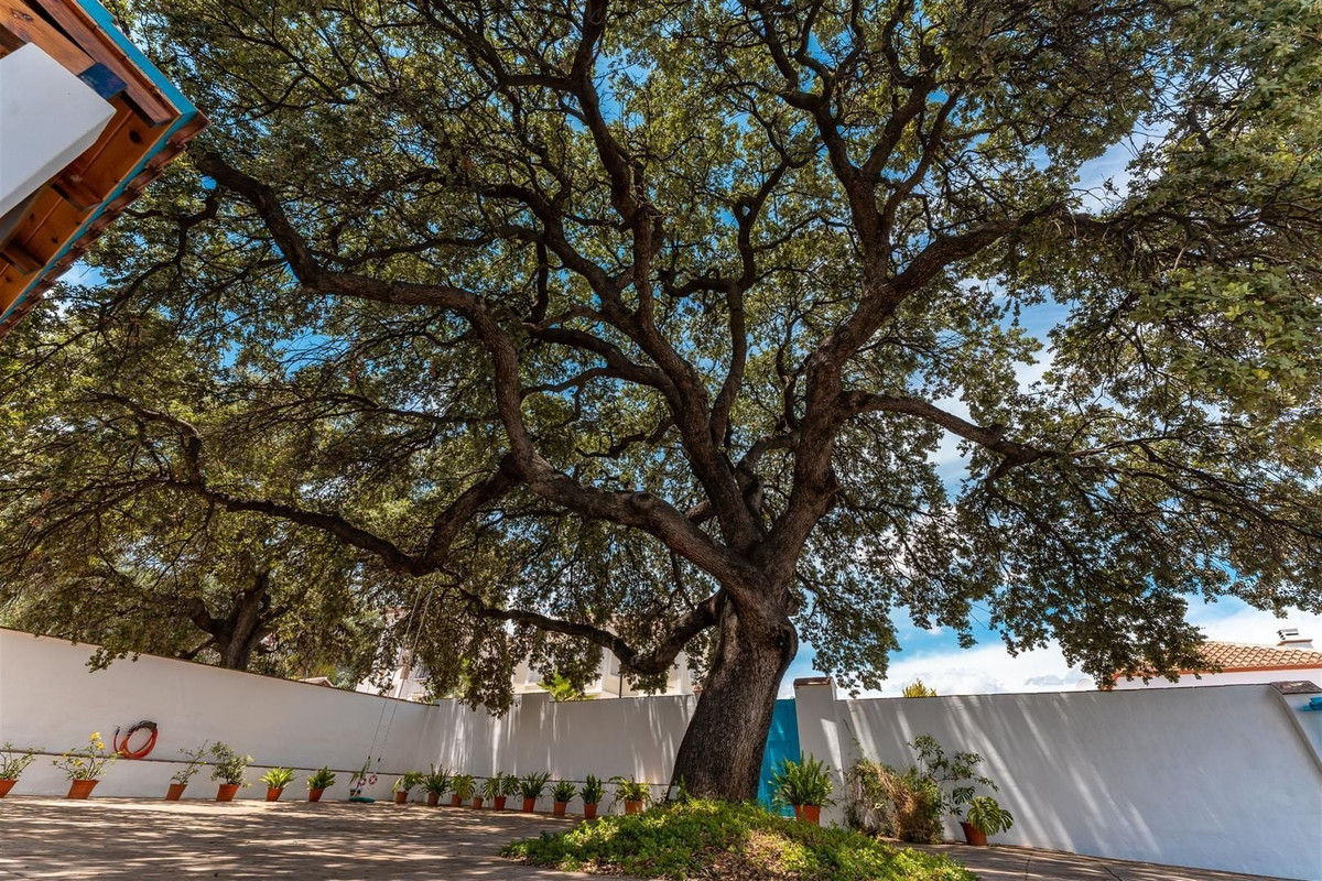 Cette superbe propriété de style andalou traditionnel, agrémentée d'équipements modernes, est située dans un quartier résidentiel prisé en périphérie d'Alhaurín el Grande. Un portail s'ouvre sur une cour spacieuse avec parking pour plusieurs voitures, abritée par un chêne tricentenaire. La propriété, en retrait de la route, offre une grande intimité. Une porte andalouse traditionnelle, aux poutres apparentes sombres, donne sur le hall d'entrée principal avec son escalier ouvert et ses hauts plafonds. À droite, des portes doubles mènent à un grand salon pouvant accueillir une table à manger. Une cheminée et une poutre apparente traditionnelle ajoutent du cachet à cette pièce. De là, on accède à la terrasse extérieure donnant sur le jardin et la piscine. La terrasse est également accessible depuis la cuisine entièrement équipée. En revenant au hall d'entrée principal, on trouve à gauche une chambre double et une salle de bains, ainsi qu'une buanderie attenante à la cuisine. L'escalier ouvert mène au premier étage qui comprend trois chambres doubles et une salle de bains familiale avec douche séparée et baignoire sur pieds. Le sous-sol a été transformé en une spacieuse salle de jeux avec salle d'eau et pièce de rangement.