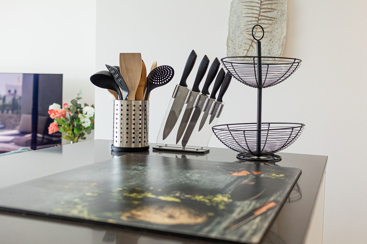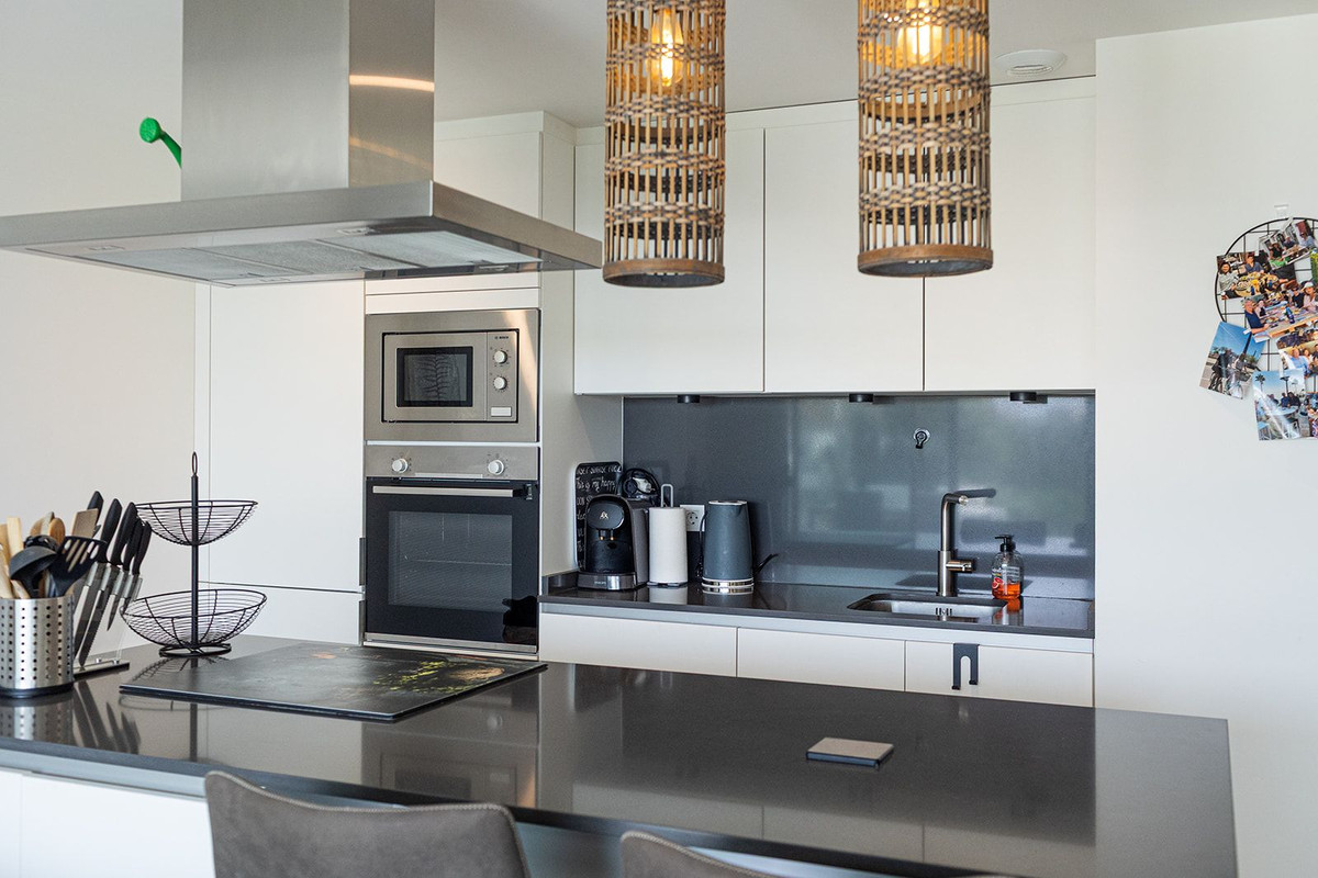 La cuisine entièrement équipée présente des finitions haut de gamme et s'intègre parfaitement à l'espace de vie, ce qui la rend idéale au quotidien comme pour recevoir des invités. Les deux chambres sont spacieuses et dotées de placards intégrés et de salles de bains élégantes à l'esthétique moderne et apaisante.