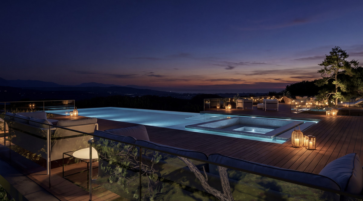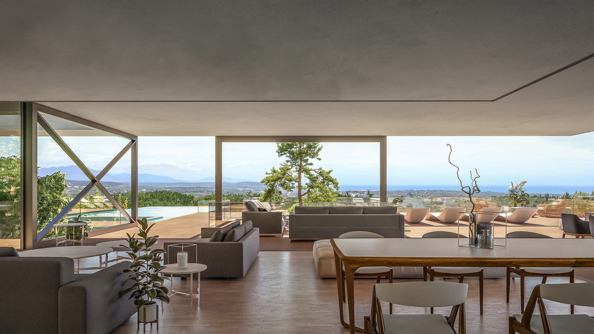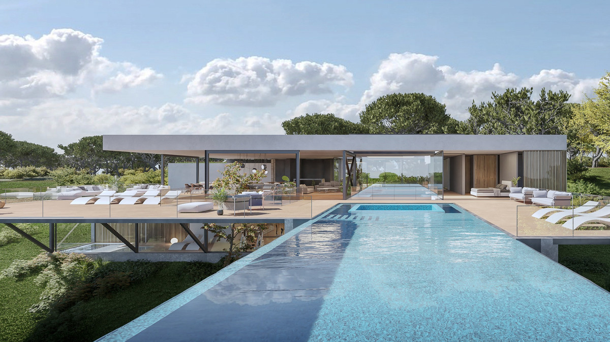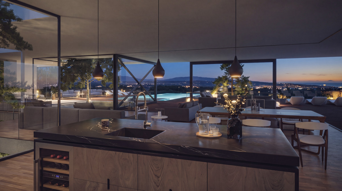 La villa s'étend sur plusieurs niveaux, avec un espace de vie lumineux et ouvert au dernier étage. Ce niveau donne directement sur une terrasse couverte et des espaces extérieurs offrant une vue panoramique. Le niveau inférieur abrite les suites parentales et est accessible par ascenseur ou par escalier. La conception permet également d'ajouter des options telles qu'une piscine intérieure et une salle de sport privée, selon vos besoins.