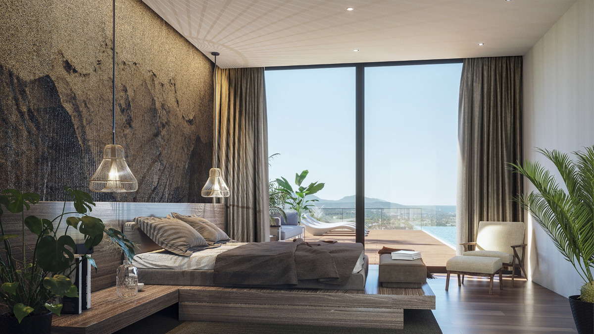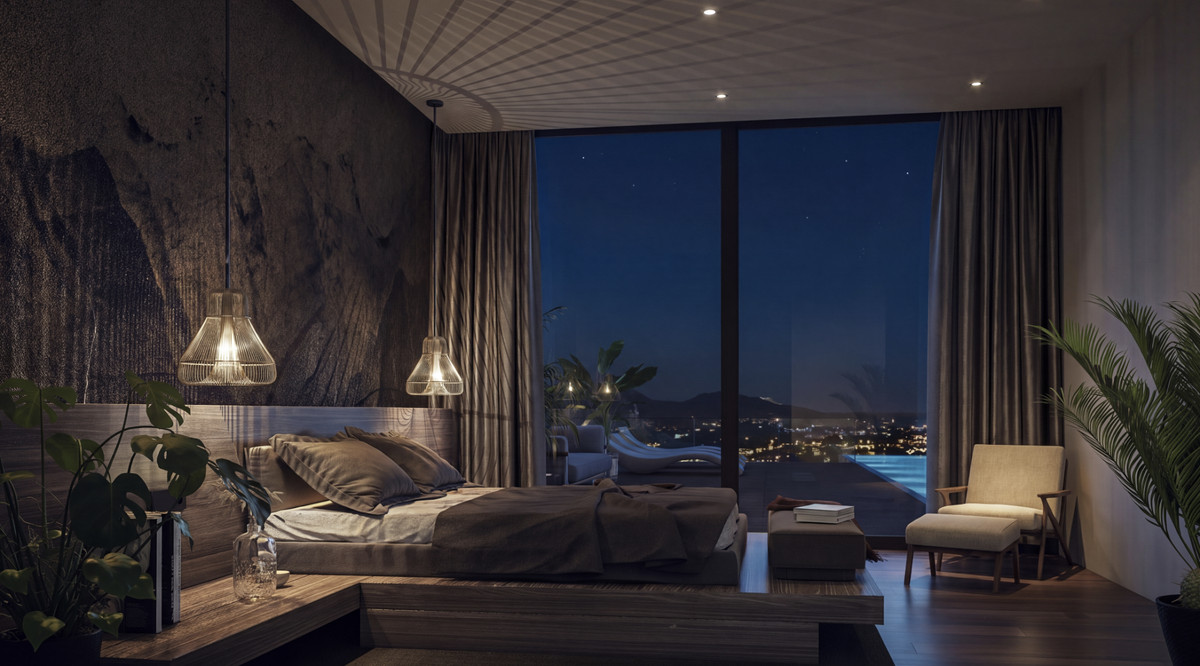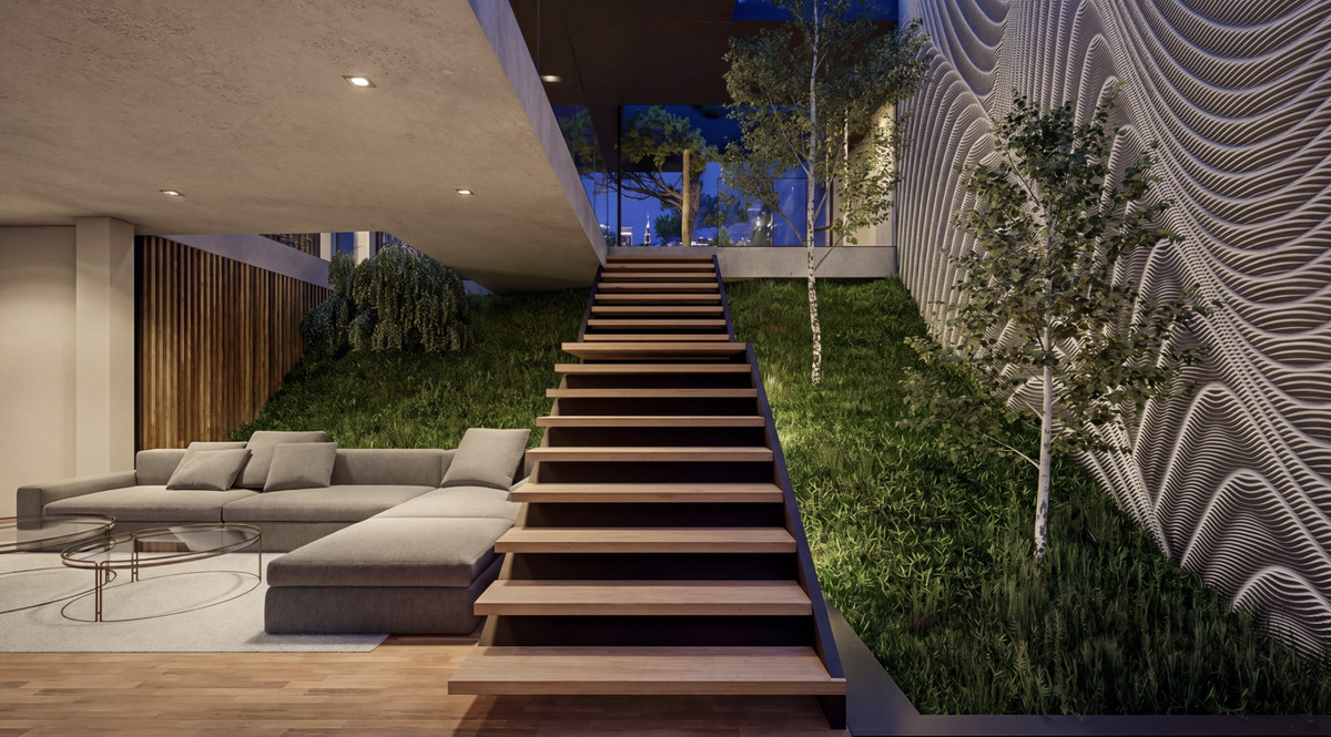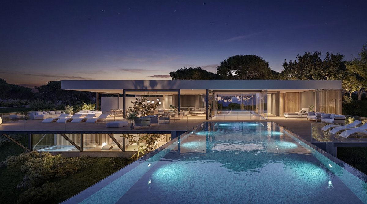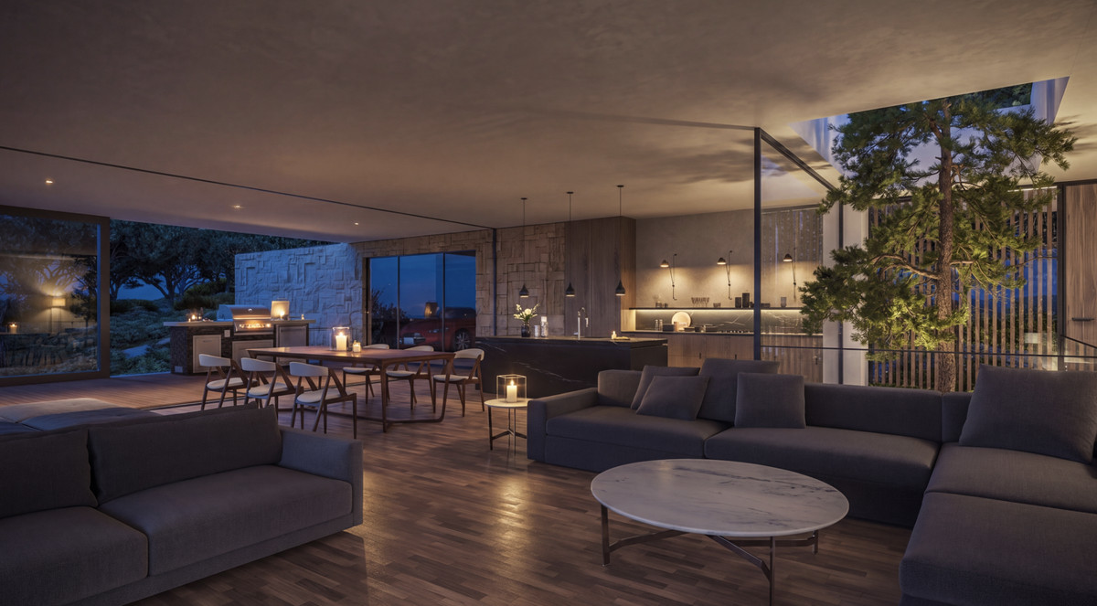 La villa s'étend sur plusieurs niveaux, avec un espace de vie lumineux et ouvert au dernier étage. Ce niveau donne directement sur une terrasse couverte et des espaces extérieurs offrant une vue panoramique. Le niveau inférieur abrite les suites parentales et est accessible par ascenseur ou par escalier. La conception permet également d'ajouter des options telles qu'une piscine intérieure et une salle de sport privée, selon vos besoins.