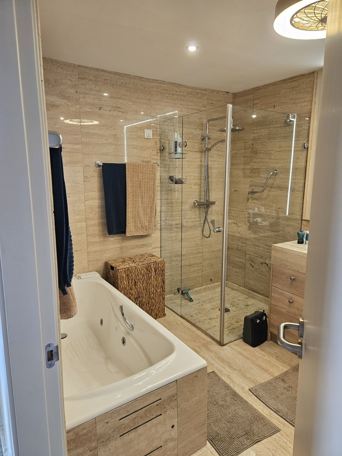 Le séjour, lumineux et spacieux, se compose d'un coin salon cosy et d'une salle à manger séparée. Grâce à une baie vitrée moderne entièrement ouvrante, l'intérieur et l'extérieur se fondent harmonieusement. La grande terrasse, véritable atout, est équipée d'un chauffage infrarouge, de stores et d'une autre baie vitrée ouvrante – idéale en toute saison. Par temps clair, elle offre une vue imprenable jusqu'à la côte de Malaga.
